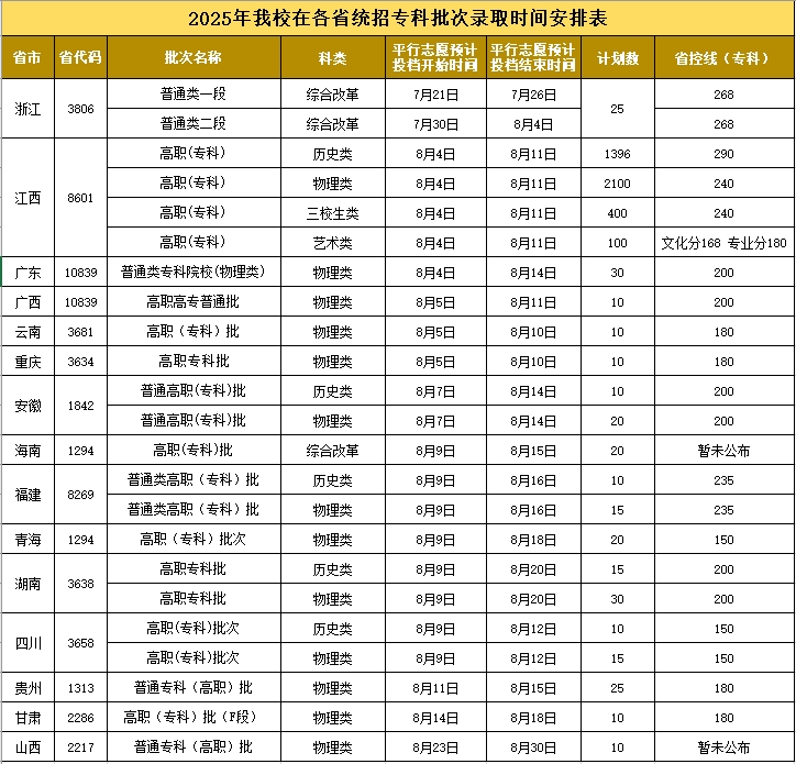 亲爱的考生们,江西工业职业技术学院2025年普通高考招生录取工作即将开始!为了让大家更加方便快捷地了解我校各省份(自治区、直辖市)的录取进展情况,现将我校2025年普通高考各省份(自治区、直辖市)的详细录取时间公布如下: