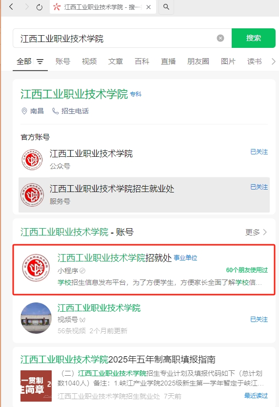 1、打开微信,搜索“江西工业职业技术学院招就处”小程序,进入后点击主页面的录取查询即可开始查询。