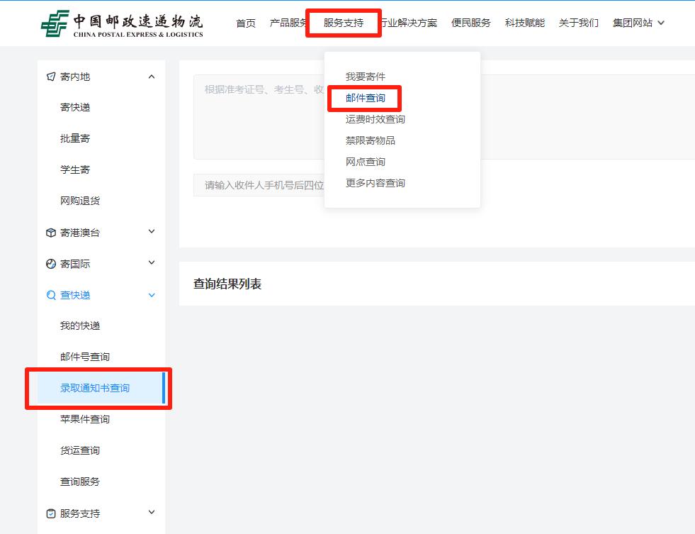 经查询被我校录取的考生,可登陆EMS官网(http://www.ems.com.cn/),点击"服务支持"→"邮件查询"→"录取通知书查询"进入查询页,输入考生号即可第一时间掌握派送进展。