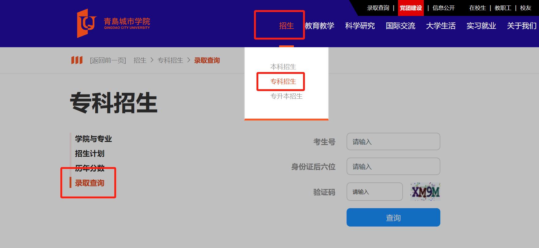 查询方法:可以登录我校官网(https://www.qdc.edu.cn/),选择"招生-专科招生",在左侧导航栏点击"录取查询"后输入身份证后六位及考生号即可查询录取信息及通知书快递单号。
