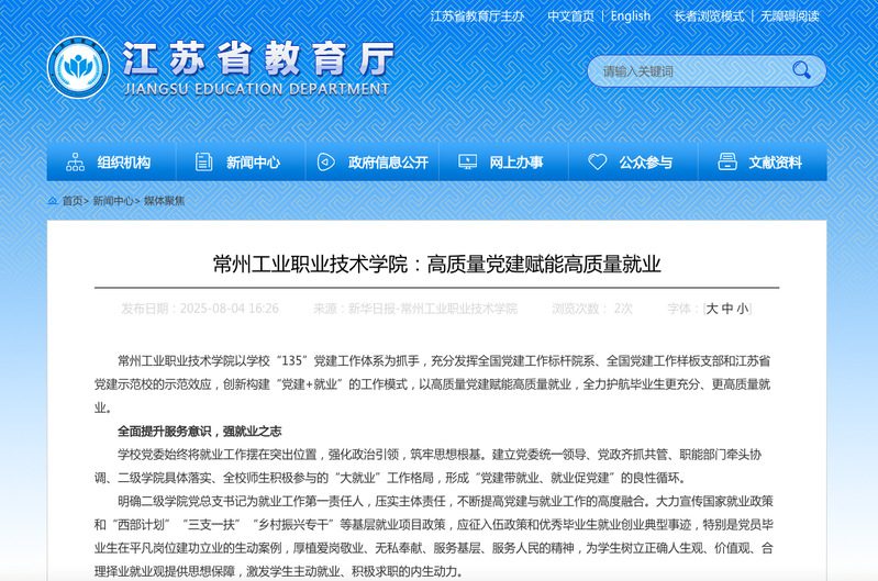 江苏省教育厅:常州工业职业技术学院:高质量党建赋能高质量就业