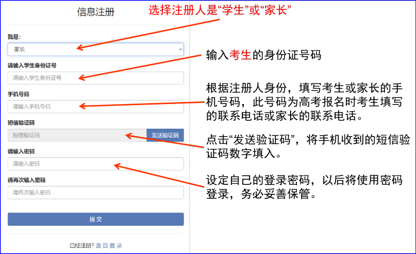 考生或家长注册登录时会使用考生高考报名时填报的信息和电话号码进行身份验证。