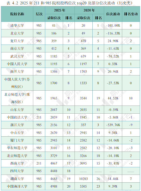 历史科目招生院校数量相对稳定,因此985院校位次排名变动较小,录取位次排名较去年提升最多的是北京师范大学(珠海校区),位次排名由去年的第19位上升至第9位,下降最多的是浙江大学,位次排名由去年的第3位下降至第12位。