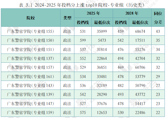 3. 历史科目:广东警官学院包揽位次上涨前10专业组