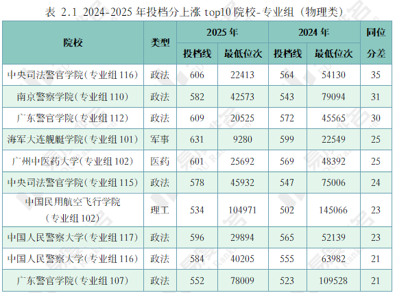下表展示了物理科目投档最低位次上涨top10的院校-专业组投档信息,其中含7个政法类院校。中央司法警官学院(专业组116)同位分上涨幅度最大,上涨了35分,该专业组包含监狱学、司法警察学两个专业,只招女生,近两年录取位次涨幅上万位,今年更是以3万多位的涨幅刷新记录。