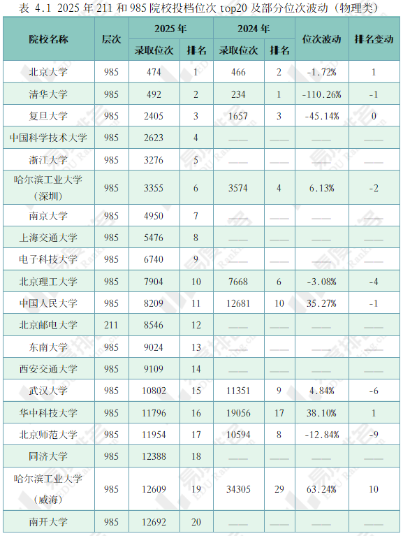 4. 985和211:物理科目因招生院校增多,多个985院校位次下降