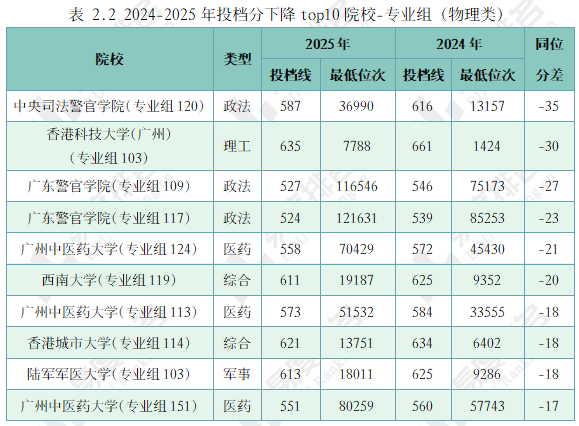 下表展示了物理科目投档最低位次下降top10的院校-专业组投档信息,中央司法警官学院(专业组120)降幅最大,达35分。