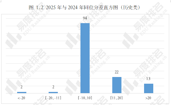 图1.1和图1.2展示了广东2025年提前批普通类本科院校-专业组投档最低分与上一年度同位分差值的直方图,差值为负代表院校-专业组2025年的投档位次有所下降,反之则代表院校-专业组的投档位次有所上升。