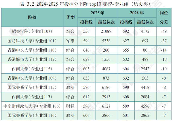 下表展示了历史科目投档最低位次下降top10的院校-专业组投档信息,除韶关学院(专业组107)、国防科技大学(专业组101),其他院校专业组同位分差降幅均小于15分。