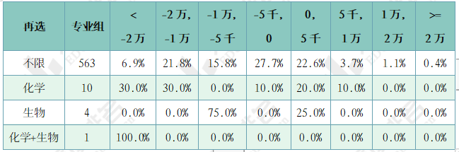 下表展示了江苏院校-专业组各选科的投档位次差分布情况,其中不限再选科目的专业组占比达到97.4%。不限再选科目的专业组中位次下降超1万位的占比达到28.77%,而位次上升1万位的占比仅1.4%。
