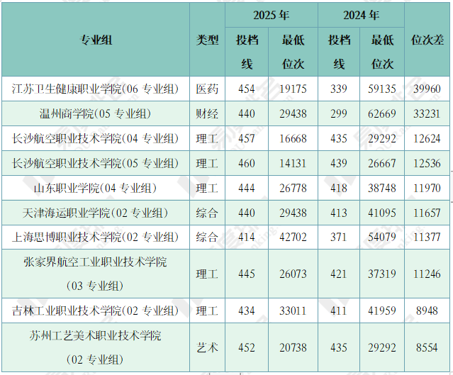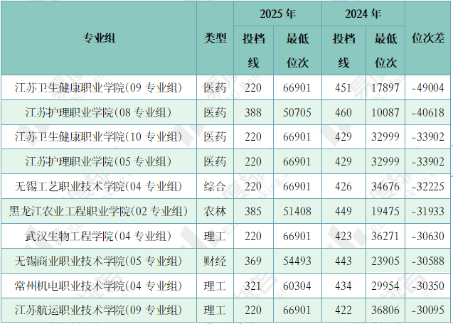 注:1.专业组以2025年为准,2024年的投档线及位次为该专业组下各招生专业的最小值;2.仅统计2024-2025年均招生的专业组;3.位次差=2024年最低投档位次-2025年最低投档位次。