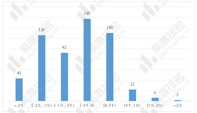 下图展示了江苏2025年物理类普通专科批院校-专业组投档最位次与上一年度最低位次差值的直方图,差值为负代表院校-专业组2025年的投档位次有所下降,反之则代表院校-专业组的投档位次有所上升。