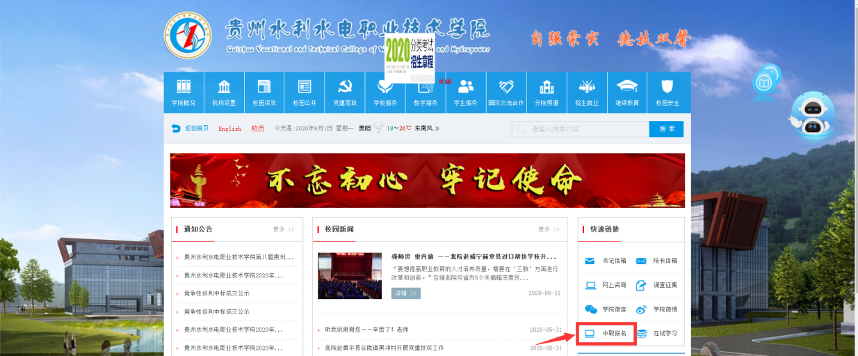 第二步:登录贵州水利水电职业技术学院官网首页,点击右下角快速链接中职报名,根据提示填写个人信息,"*"为必填项,并且提交;