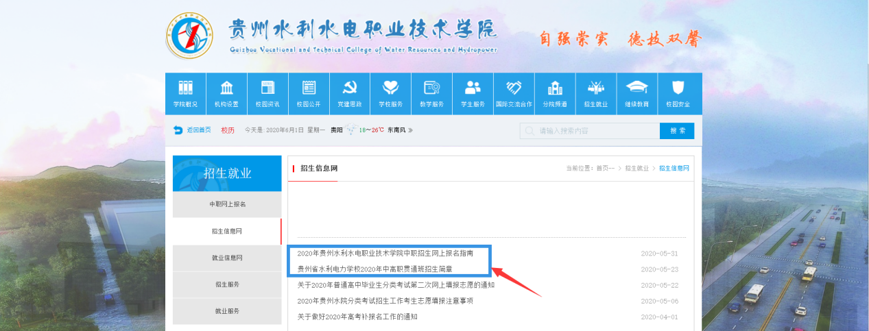 第一步:登录贵州水利水电职业技术学院官网招生就业子栏目,点击招生信息网,查看2020年中职招生简章,了解专业信息,确定报读校区和专业;