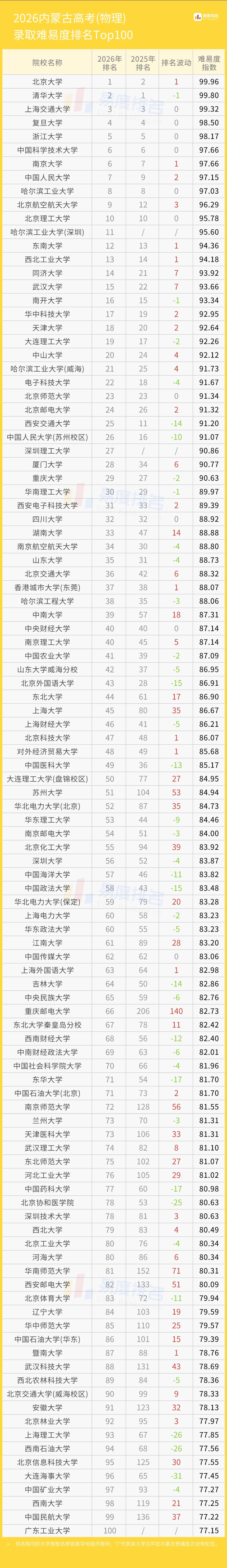 内蒙古2025年迎来“3+1+2”新高考改革元年,这场变革不仅颠覆了传统计分方式,更引发了高校录取格局的剧烈震荡。易度排名今天为大家揭晓“2026年内蒙古高考录取难易度排名Top100(物理类)”。想获取完整排名,请在“易度排名”公众号后台私信“2026内蒙古物理”。