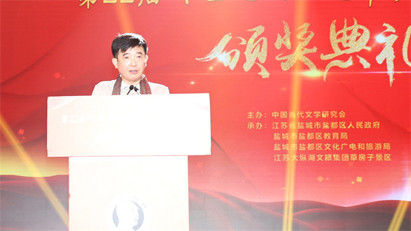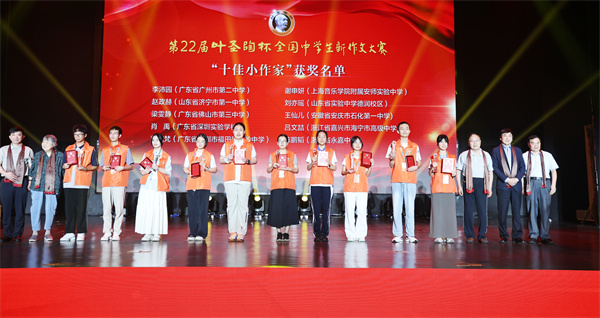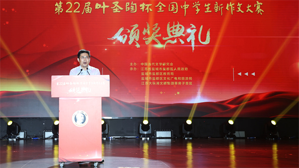 8月3日,第22届叶圣陶杯全国中学生新作文大赛颁奖典礼在盐城草房子景区隆重举行。大赛顾问、著名诗歌理论家、中国当代文学研究会原副会长、首都师范大学文学院教授吴思敬,著名作家、国际安徒生奖获得者、北京大学文学讲习所所长曹文轩,大赛评委会副主任、著名语文教育专家、人民教育出版社编审顾之川,著名文学评论家、全国政协委员、山东师范大学教授李掖平,叶圣陶先生孙女叶小沫,叶圣陶先生嫡孙叶永和,文学评论家、中国作家协会《文艺报》总编辑刘颋,一级作家、山东省作家协会主席团委员、青岛作家协会副主席、《青岛文学》杂志主编李林芳,文学专家、山东大学文学院常务副院长、教授、中国当代文学研究会校园文学委员会副理事长马兵,文学专家、南京师范大学国际交流学院院长、教授孙道功,校园文学专家、大赛组委会副主任王世龙,语言学专家、中国当代文学研究会校园文学委员会副理事长、中国传媒大学人文学院副教授蒋成峰等来自全国各地文学界、教育界、新闻出版界的知名专家学者齐聚一堂,与获奖师生代表共同见证这场文学盛宴,在文字的碰撞中传递教育初心,在思想的交流中点燃创作火种。盐城市委宣传部副部长、市文明办主任张孝荣,盐都区委常委、宣传部副部长吕杨,副区长陈晶晶等出席活动。