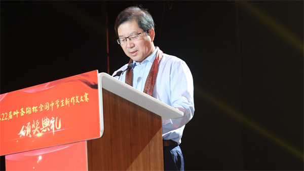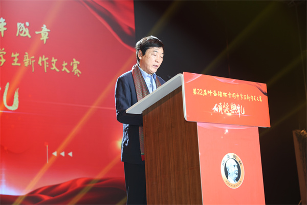 参赛学校指导教师代表、山东省临沂第四中学袁春老师在发言中祝贺选手们获奖来之不易,从初赛到决赛一路奋进,今天终于在“草房子”这片文学沃土上绽放青春。他说,大赛对学校语文教学、教师成长、学生发展及校园文化建设都有积极的推动作用,今后将继续传递大赛宗旨,发扬叶圣陶精神,为提升学生综合素养贡献更大力量。