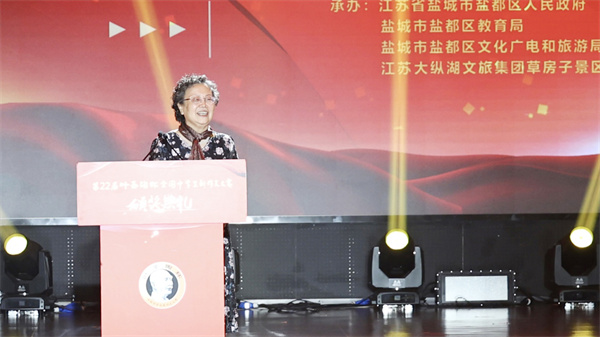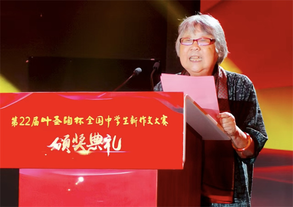 大赛顾问叶小沫在致贺辞中表达了对盐城市盐都区以及各地有关单位支持赛事、承办颁奖活动的感激之情,对获奖同学表示衷心的祝贺。她介绍了叶圣陶先生做人作文的原则,告诉同学们一定要把做人和作文结合起来。她把参赛选手比喻为蒲公英,开出金黄色的小花,结出绒球般的果实,风一吹便如小伞兵般飞向四方,大赛也随之将叶圣陶的语文和作文思想散播至各地,这正是大赛一届一届办下去的力量和意义。
