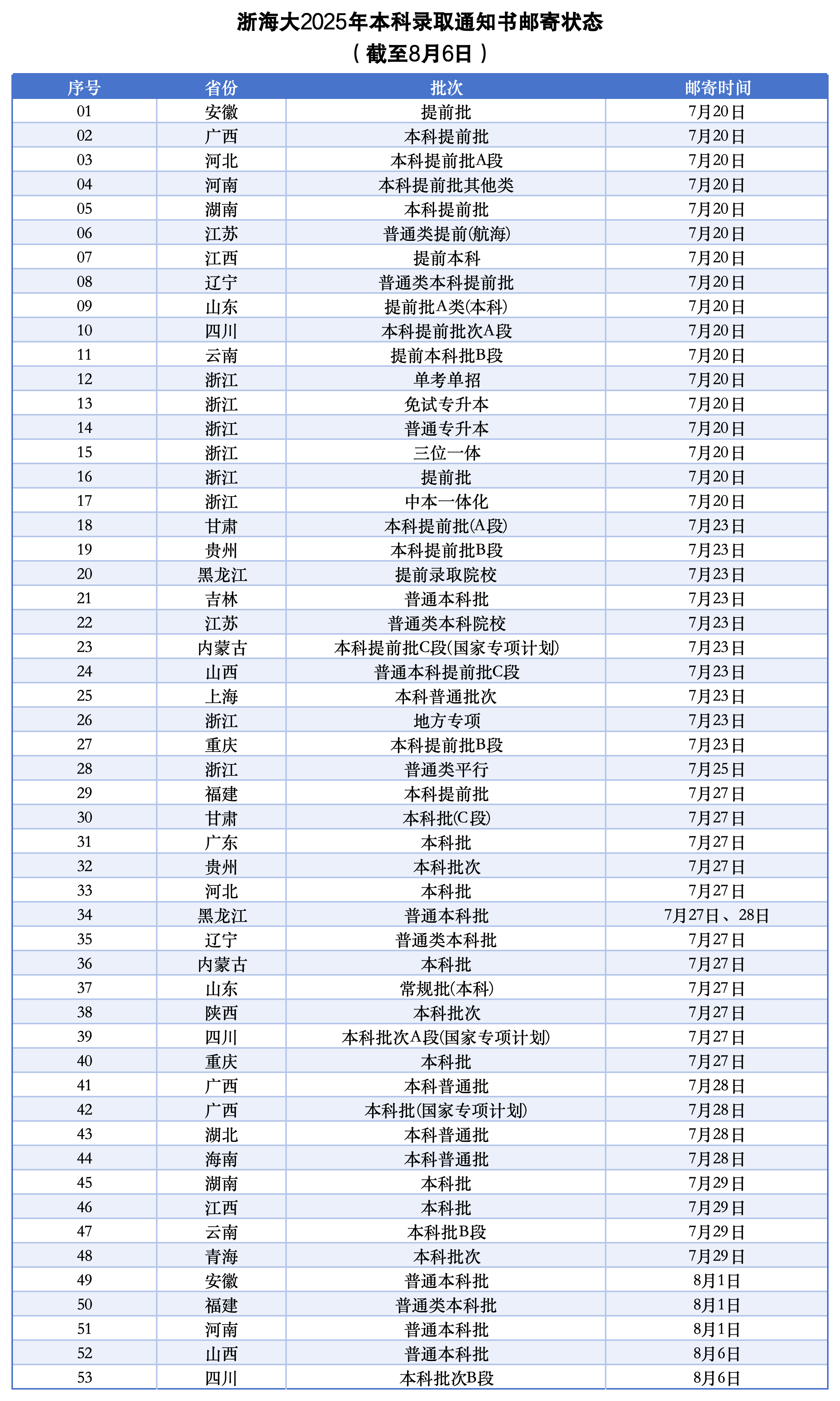 浙江海洋大学2025年本科录取通知书邮寄状态(截至8月6日)见下表所示。