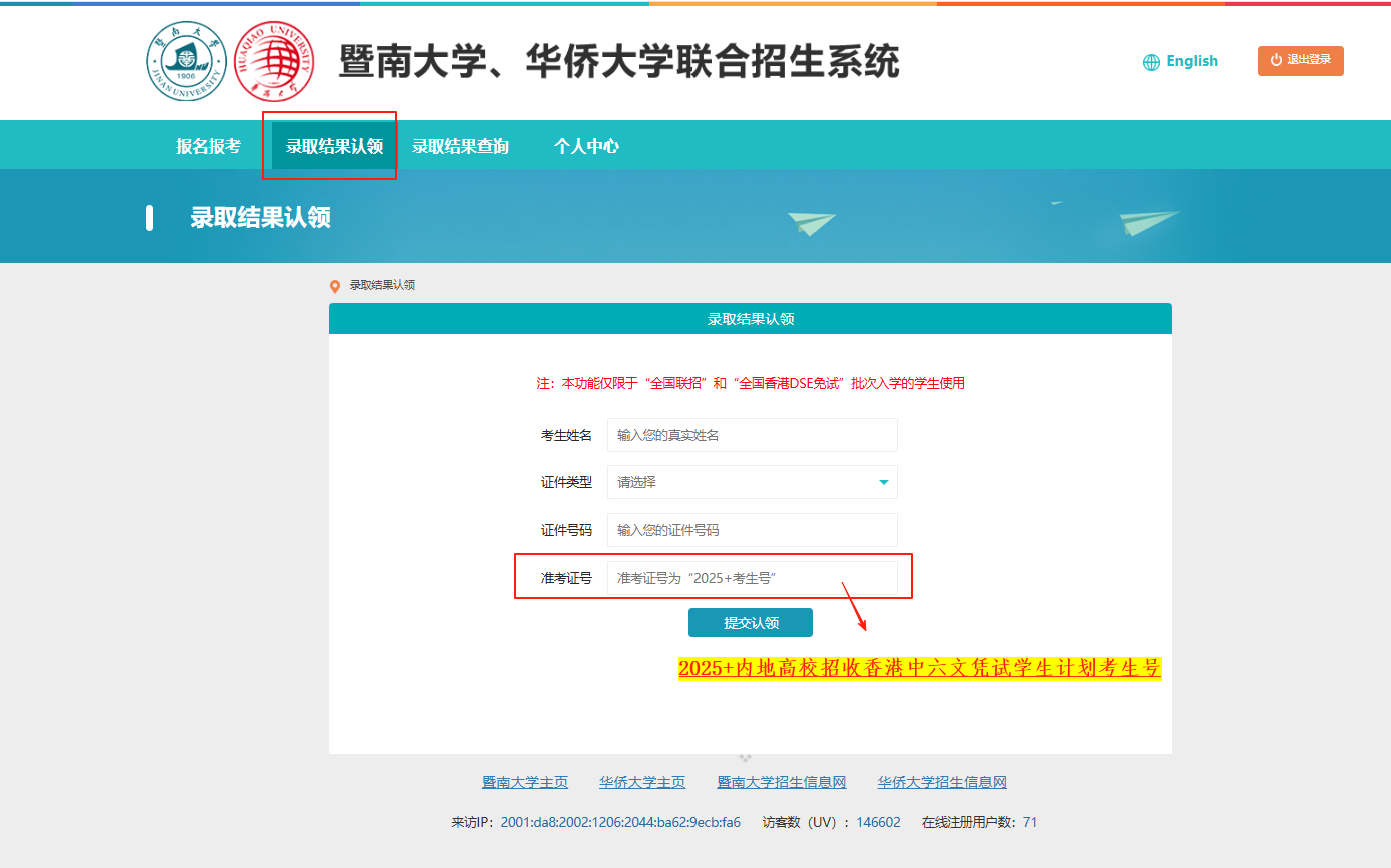 通过内地高校招收香港中六文凭试学生计划录取的学生,需先在两校联招系统自行注册账号,经核实个人信息后,方可在“录取结果认领”界面查询录取结果。请注意,“录取结果认领”界面所填写的准考证号为“2025+内地高校招收香港中六文凭试学生计划考生号”。