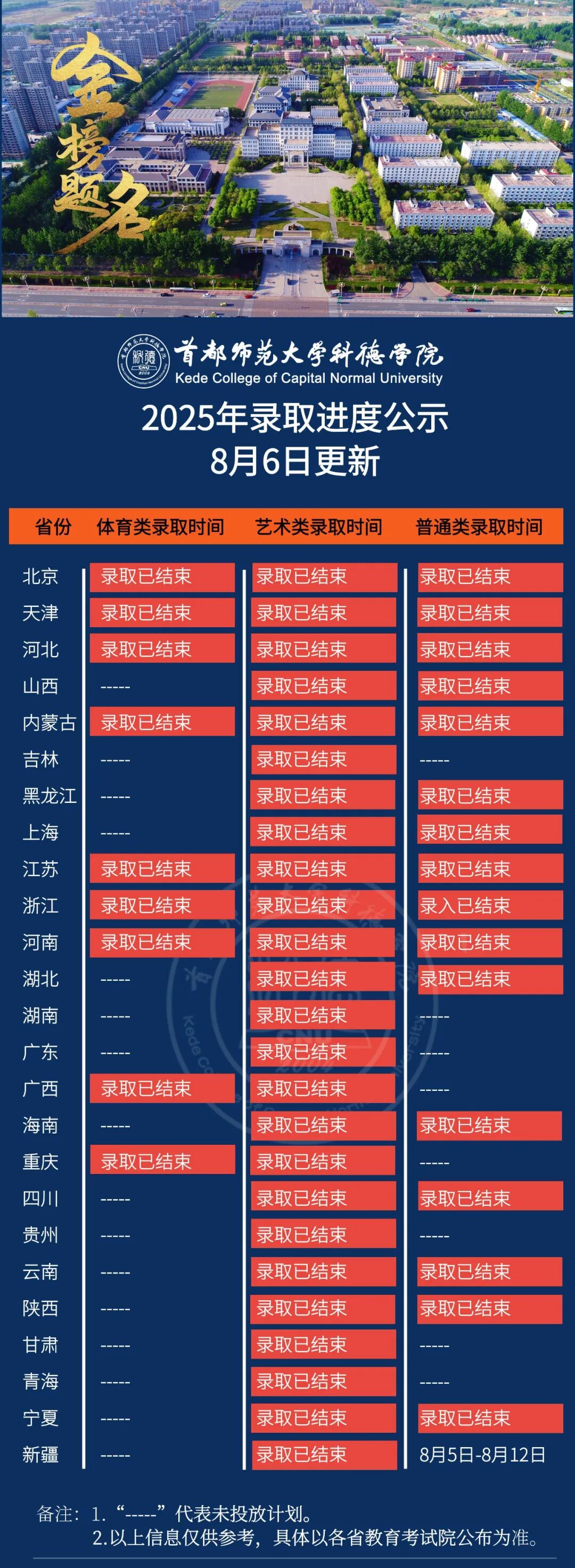 首都师范大学科德学院2025年高招录取进度(8月6日更新)