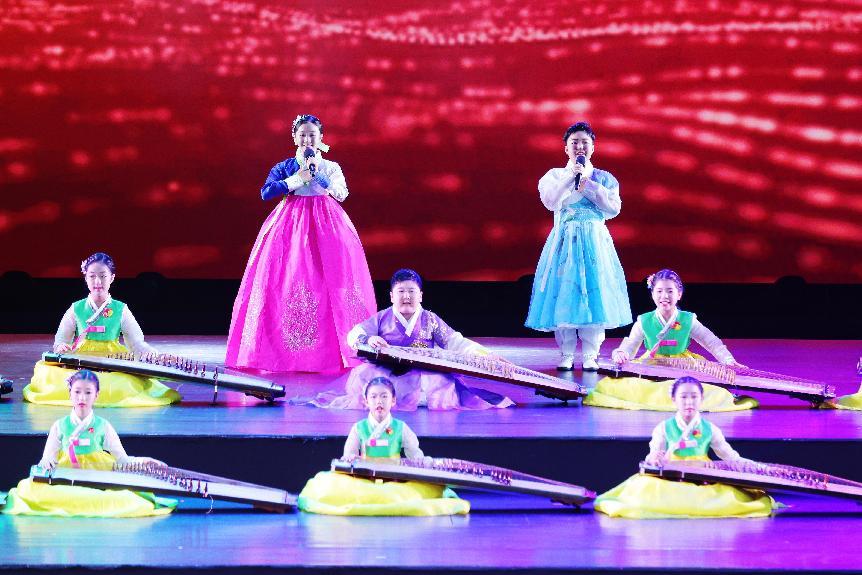 在活动中,来自延吉市新兴小学的50名同学用被列为国家级非物质文化遗产的中国朝鲜族伽倻琴,合奏了一曲《大中国》。乐曲豪迈的基调融入朝鲜族传统“阳山道”节奏,以长鼓韵律与民乐编配的形式赋予曲调新的活力,展现了多民族文化交流交融的爱国情怀,让这首赞歌在传统与现代的碰撞中焕发独特的艺术魅力。