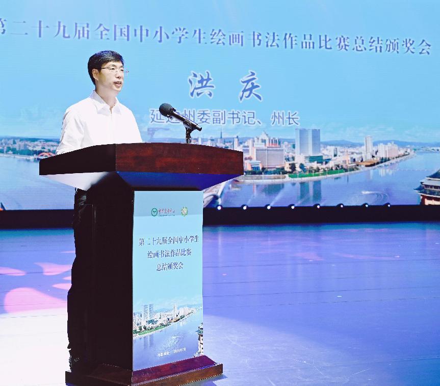 洪庆在致辞中表示,本次活动在延边举办,是弘扬中华文化、促进各民族交往交流交融的宝贵契机。全国各地学生的书画作品,展现了包括朝鲜族在内的各民族的文化传承,共同构成中华民族多元一体文化的生动图景。这不仅是一场艺术盛宴,更是传承优秀传统文化、铸牢中华民族共同体意识的生动实践,推动中华民族共同体意识深植于青少年心中。