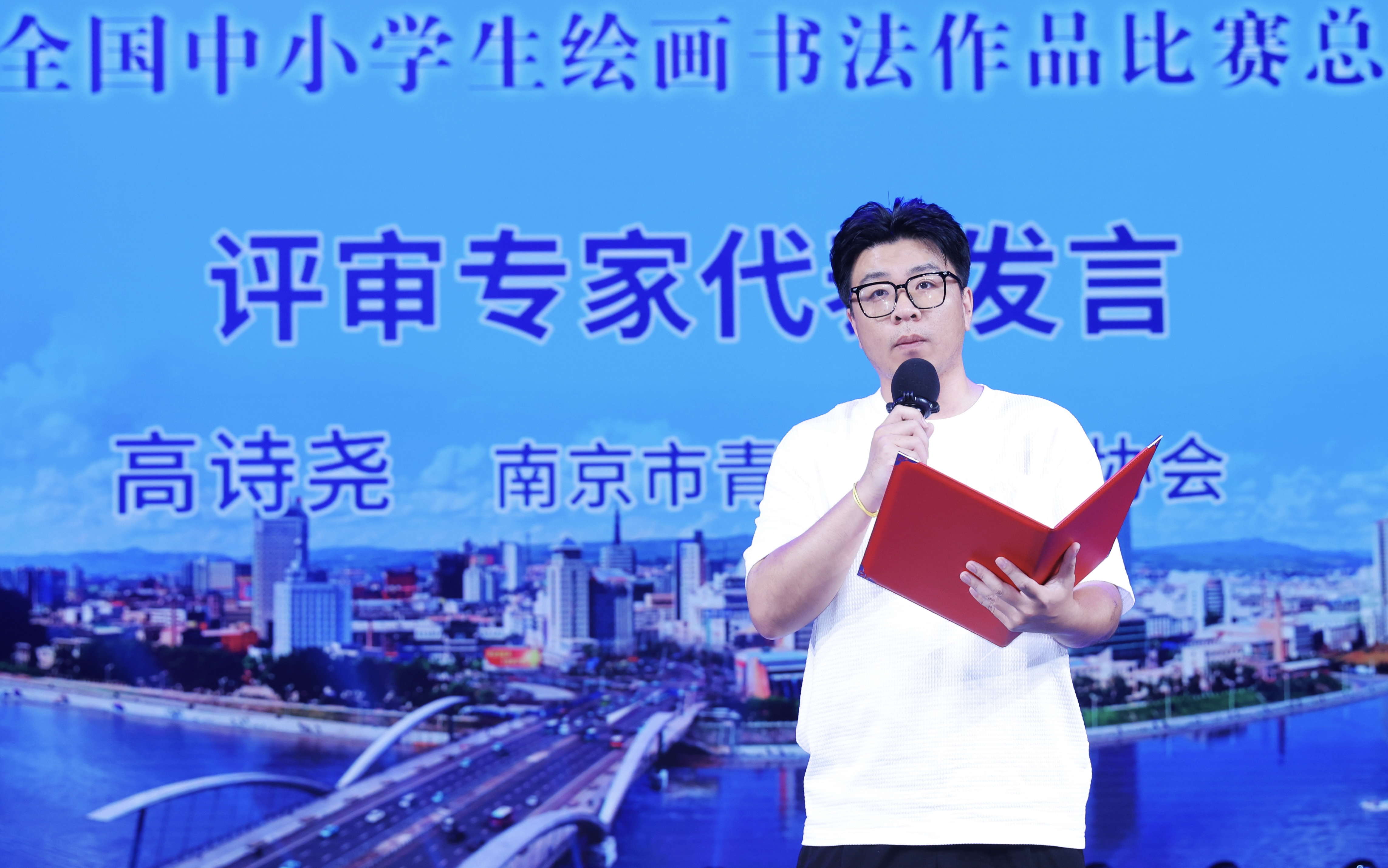 南京市青年书法家协会高诗尧代表本届比赛书法组评审专家,介绍了专家在评审中秉持“专业为尺,育人为本”的原则,对作品在诠释“中国风”中与主题的契合度、专业规范与童真童趣的平衡性以及整体感与观感的综合性等三个评审维度。