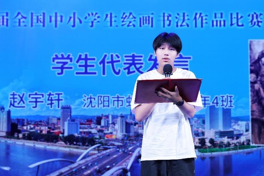沈阳市虹桥中学八年4班的赵宇轩作为获奖学生代表,分享了自己创作的作品《古韵雅乐》中所展现“中国风”,以及要用手中画笔讲述动人的中国故事、描绘属于新时代“雅乐”的理想。