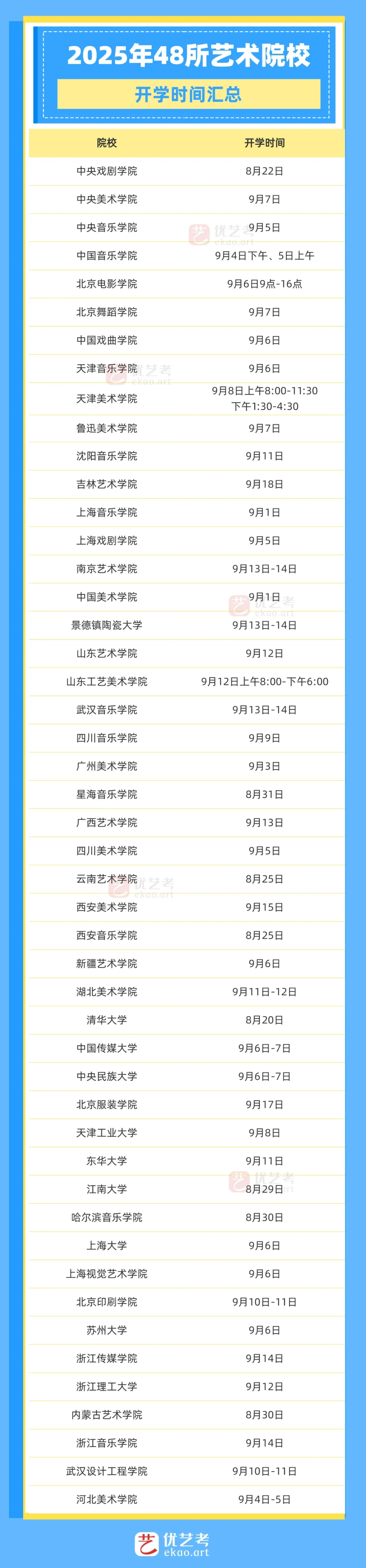 目前,各大高校招生录取工作基本结束,各大高校开学时间也是各位准大一新生和家长比较关心的问题。优艺考翻了48所高校的录取通知书整理出了这份开学时间表,大一新生快收藏。