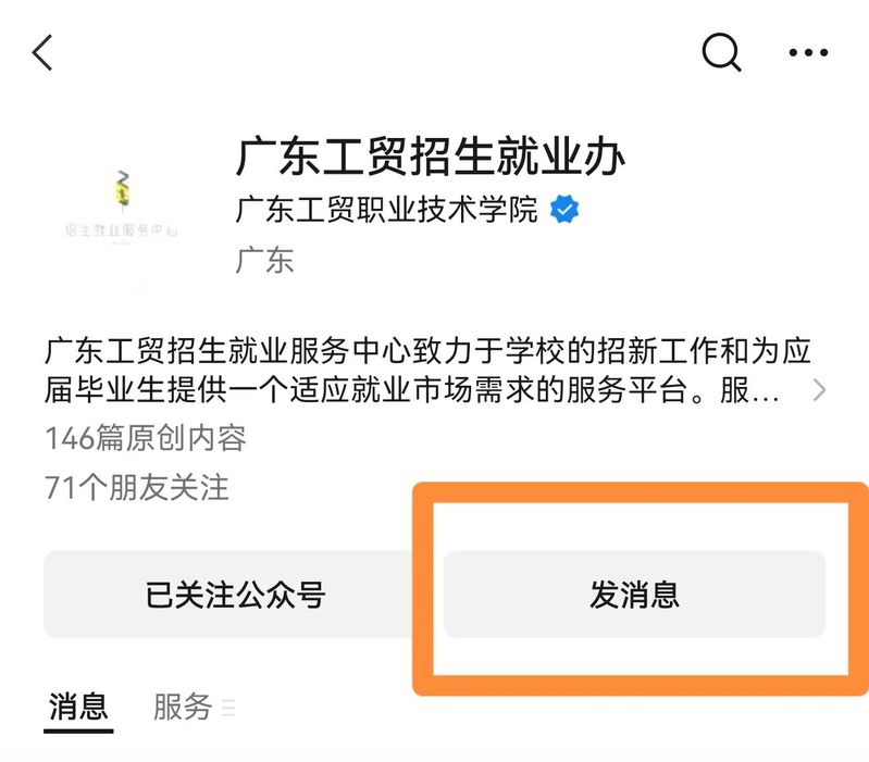 第一步:关注“广东工贸招生就业办”微信公众号,点击“发消息”。