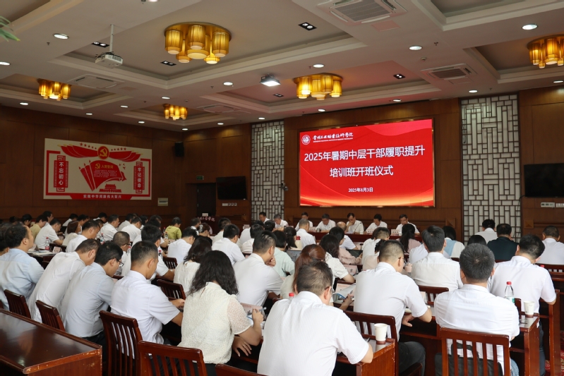暑假期间,我校党校聚焦“十四五”收官与“十五五”谋划的关键节点,举办2025年暑期中层干部履职能力提升培训班,旨在深入学习贯彻习近平新时代中国特色社会主义思想,贯彻落实中共中央印发的《干部教育培训工作条例》,持续推进我校干部队伍“铸魂赋能”工程。党委副书记吴丽云主持开班仪式,校领导班子成员参加并分阶段主持培训会议。
