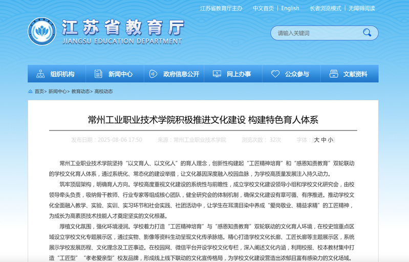 江苏省教育厅:常州工业职业技术学院积极推进文化建设 构建特色育人体系