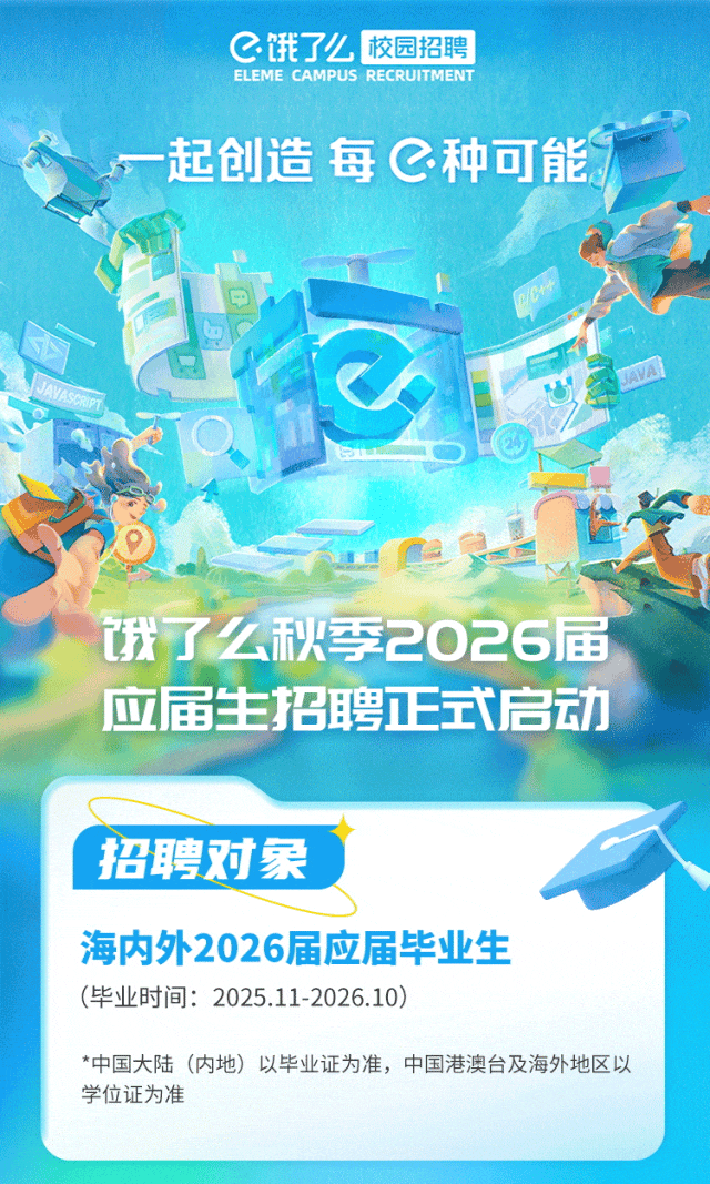阿里巴巴集团旗下各集团/公司2026届秋季校园招聘正在陆续启动中点击👉🏻阿里巴巴集团招聘官网大黄页可以直达各家招聘官网,投递心仪岗位。毕业生可同时投递阿里巴巴旗下业务集团和公司的多个岗位,提高应聘“命中率”,期待你来和我们做同事呀!阿里集团招聘官网(点击查询各家社招&校招信息)阿里巴巴控股集团 |阿里云|淘天集团|饿了么|高德|阿里国际数字商业集团|菜鸟集团虎鲸文娱集团通义实验室|阿里健康|橙狮体育|钉钉|飞猪 |盒马|灵犀互娱|平头哥亚博科技|智能互联|智能信息欢迎继续关注↓了解更多阿里集团招聘信息