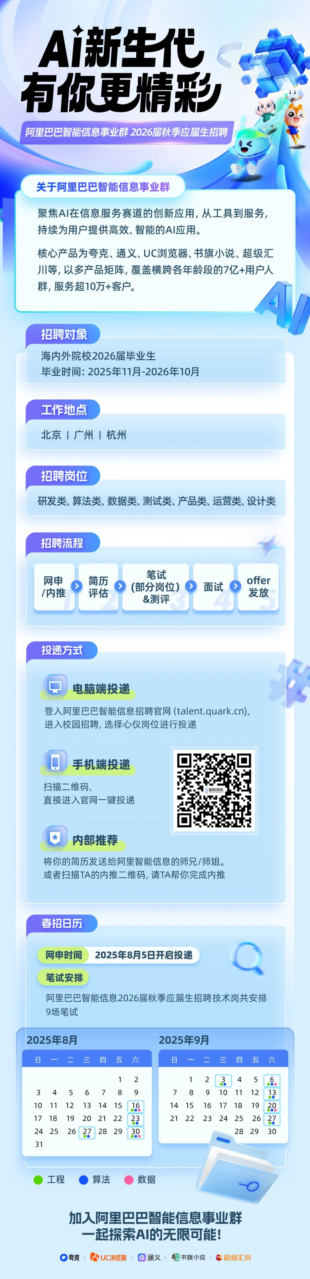 阿里巴巴集团旗下各集团/公司2026届秋季校园招聘正在陆续启动中点击👉🏻阿里巴巴集团招聘官网大黄页可以直达各家招聘官网,投递心仪岗位。毕业生可同时投递阿里巴巴旗下业务集团和公司的多个岗位,提高应聘“命中率”,期待你来和我们做同事呀!阿里集团招聘官网(点击查询各家社招&校招信息)阿里巴巴控股集团 |阿里云|淘天集团|饿了么|高德|阿里国际数字商业集团|菜鸟集团虎鲸文娱集团通义实验室|阿里健康|橙狮体育|钉钉|飞猪 |盒马|灵犀互娱|平头哥亚博科技|智能互联|智能信息欢迎继续关注↓了解更多阿里集团招聘信息