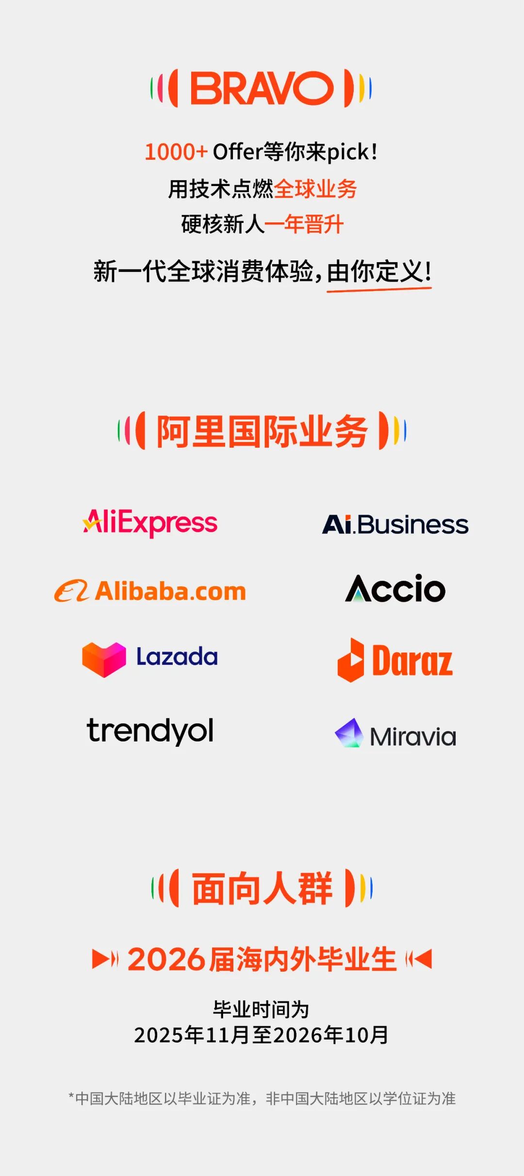 阿里巴巴集团旗下各集团/公司2026届秋季校园招聘正在陆续启动中点击👉🏻阿里巴巴集团招聘官网大黄页可以直达各家招聘官网,投递心仪岗位。毕业生可同时投递阿里巴巴旗下业务集团和公司的多个岗位,提高应聘“命中率”,期待你来和我们做同事呀!阿里集团招聘官网(点击查询各家社招&校招信息)阿里巴巴控股集团 |阿里云|淘天集团|饿了么|高德|阿里国际数字商业集团|菜鸟集团虎鲸文娱集团通义实验室|阿里健康|橙狮体育|钉钉|飞猪 |盒马|灵犀互娱|平头哥亚博科技|智能互联|智能信息欢迎继续关注↓了解更多阿里集团招聘信息