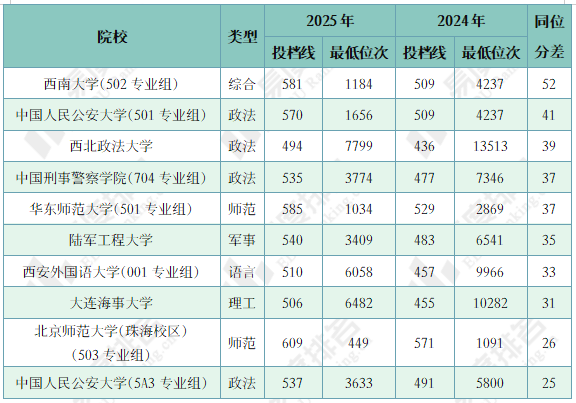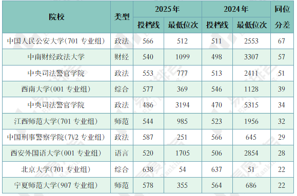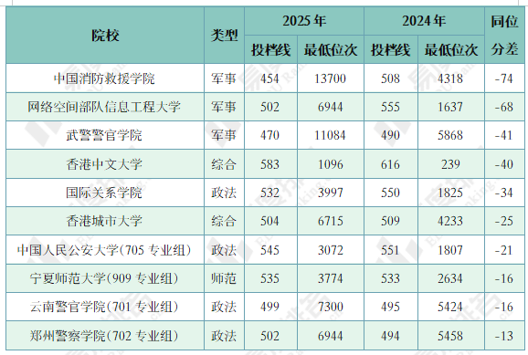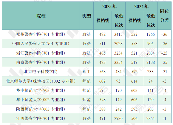 注:1.2024年同位分=2024年投档位次在2025年一分一段表中所对应的分数;2.仅含两年均招生的专业组