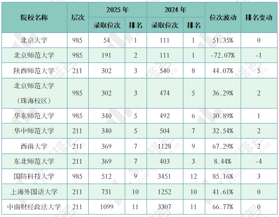 表 4.2 2024-2025年211和985院校投档位次波动(历史类)