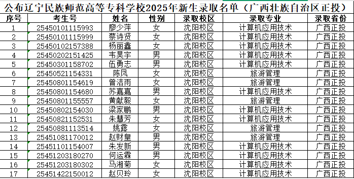 公布辽宁民族师范高等专科学校2025年新生录取名单(广西壮族自治区正投)