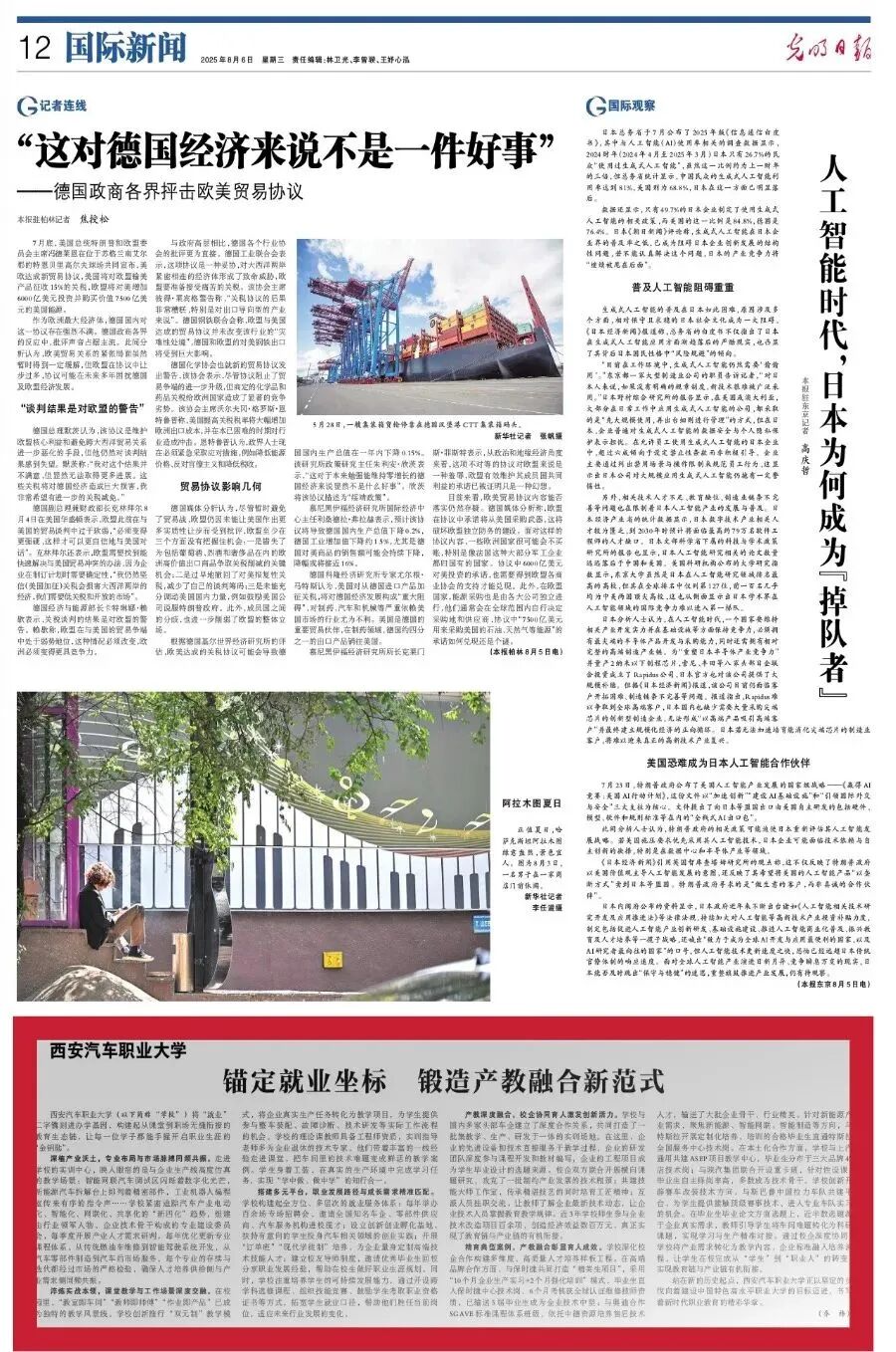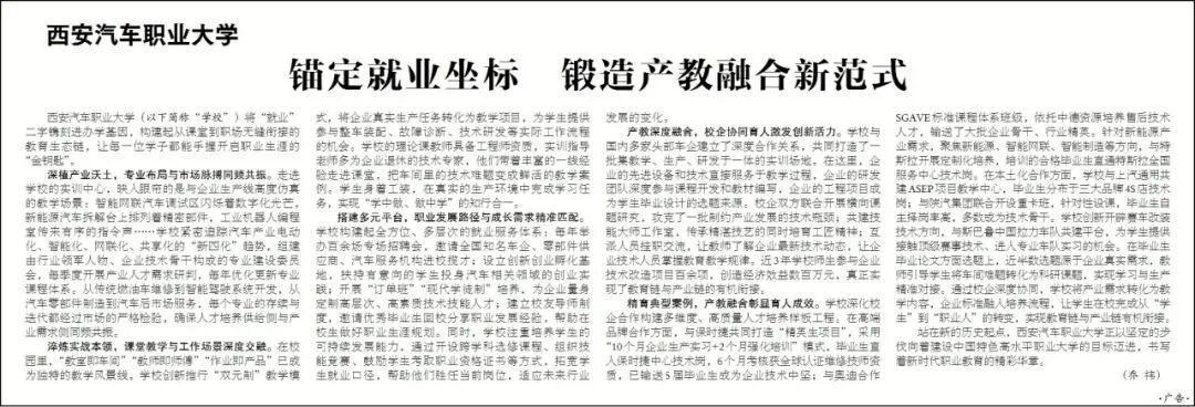 8月6日,《光明日报》刊登文章《西安汽车职业大学:锚定就业坐标 锻造产教融合新范式》。西安汽车职业大学以就业为导向,深耕产教融合,构建起从课堂到职场的无缝衔接生态,助力学子手握职业“金钥匙”。近年来,学校紧扣汽车产业“新四化”趋势,动态优化专业课程,确保人才供给与市场需求同频;创新“双元制”教学,让学生在仿真生产环境中“学中做、做中学”,实现知行合一。