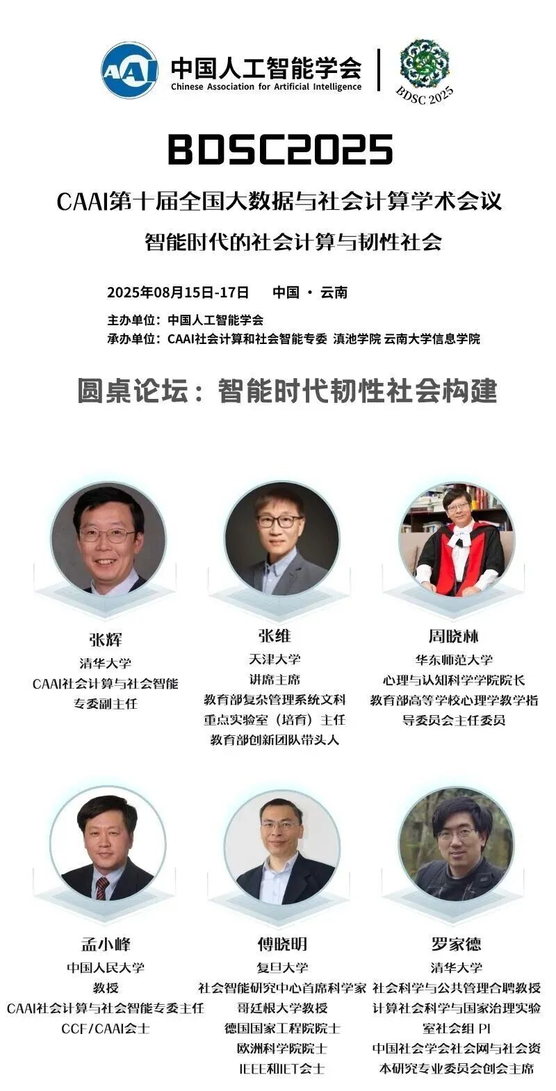 CAAI 第十届全国大数据与社会计算学术会议(China National Conference on Big Data & Social Computing,简称 BDSC2025)由中国人工智能学会主办,社会计算与社会智能专委、滇池学院、云南大学信息学院共同承办,将于2025年8月15-17日在云南昆明召开!