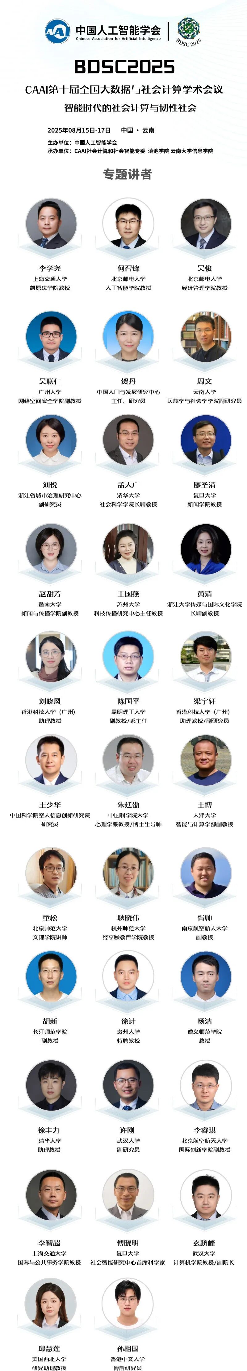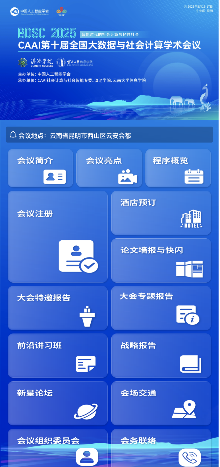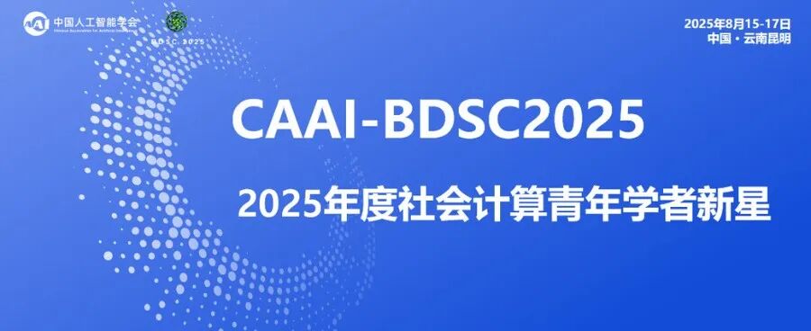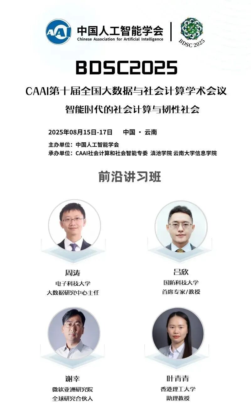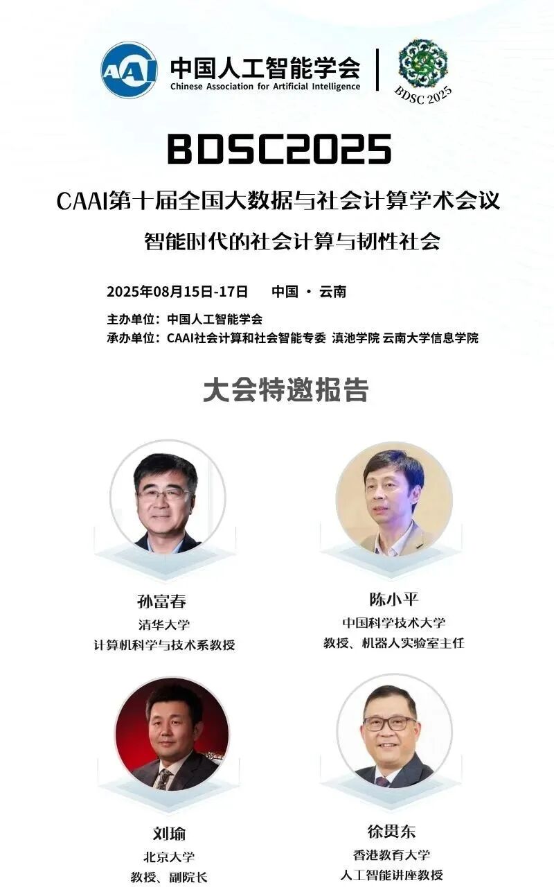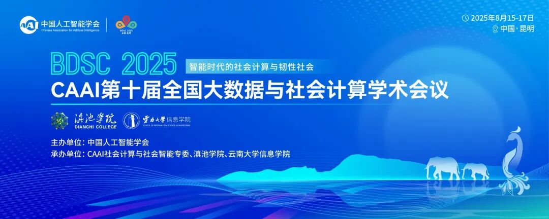 由中国人工智能学会主办,社会计算与社会智能专委、滇池学院、云南大学信息学院共同承办的CAAI第十届全国大数据与社会计算学术会议(China National Conference on Big Data & Social Computing,简称BDSC2025)将于2025年8月15-17日在昆明召开!