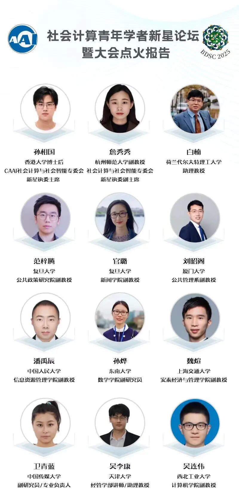会议将继续组织第六届社会计算青年学者新星论坛,以发展和壮大青年学者在社会计算和社会智能领域的作用,扩大社会计算交叉学科研究成果的影响力。经过专家推荐和评选委员会评选,11位优秀青年学者获评“2025年度社会计算青年学者新星”,并受邀参加本年度新星讲者论坛,届时将在大会进行报告。