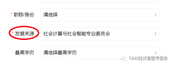 4. 在“入会须知”下方,点击“下一步”,然后填写会员信息。在“发展来源”选项中选择“社会计算与社会智能专业委员会”。