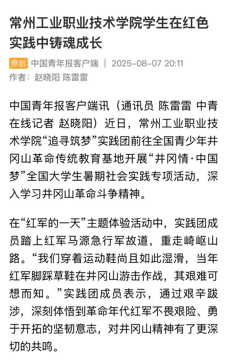 中国青年报:常州工业职业技术学院学生在红色实践中铸魂成长