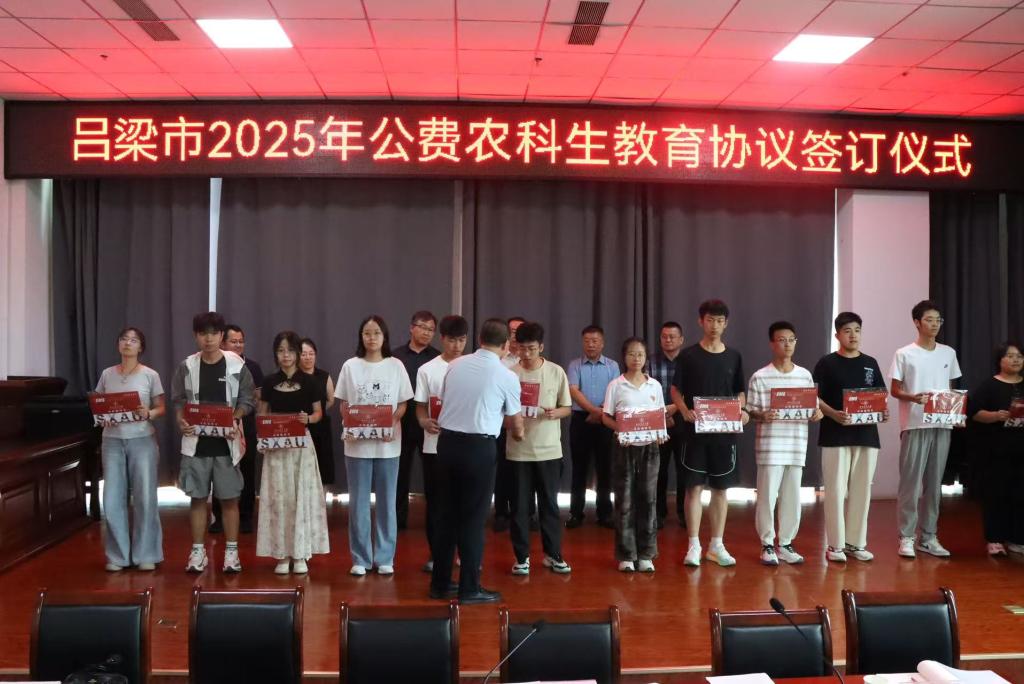 会议由吕梁市农业农村局副局长李建军主持。仪式上,山西农业大学动物科技学院党委书记陈明华现场宣读了2025年吕梁市公费农科生拟录取名单,招生办主任穆翠娥现场领学了《山西省公费农科生教育协议书》。13位学生现场签订了《山西省公费农科生教育协议书》。资源环境学院党委书记贾昊昱和学工部办公室主任陈占强为学生发放录取通知书。
