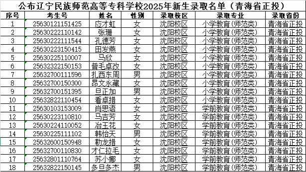 公布辽宁民族师范高等专科学校2025年新生录取名单(青海省正投)