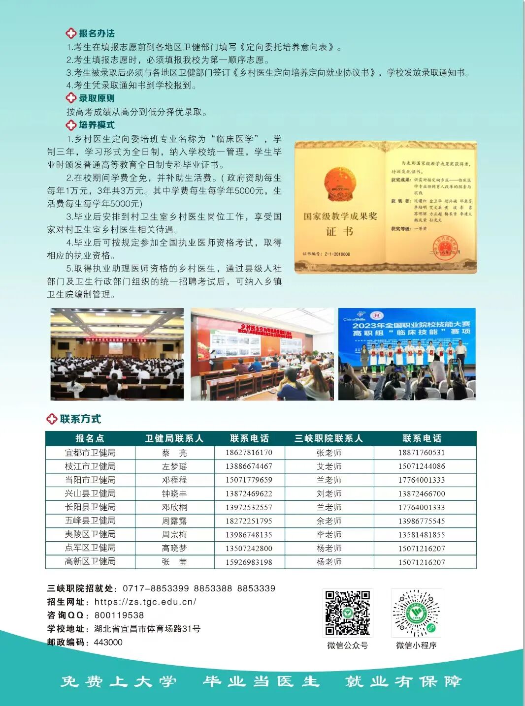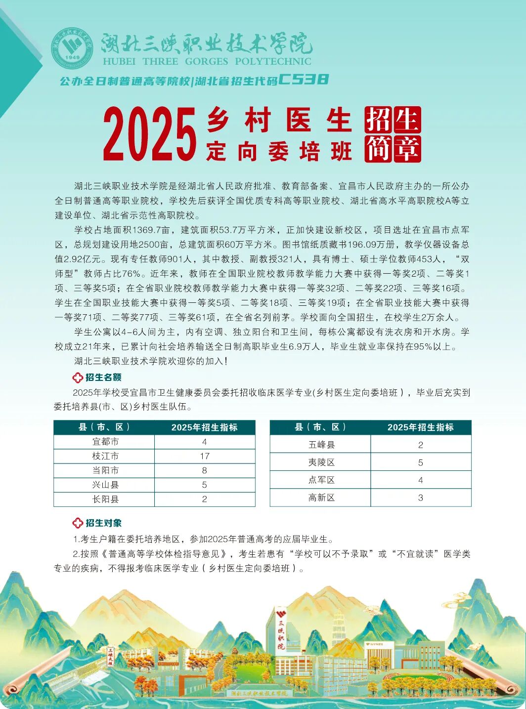 为全面推进乡村医生职业化进程,满足广大农村居民健康需求,根据省卫健委、省委编办、省教育厅等八部门《关于印发“万名大学生乡村医生配备”“万名社区医生便民服务提升”项目实施方案的通知》(鄂卫通[2021]53号)和《宜昌市大学生乡村医生管理办法(试行)》(宜卫发[2024]13号)等文件精神,宜昌市卫健委继续开展“乡村医生定向委托培养计划”,委托湖北三峡职业技术学院2025年面向宜昌地区计划招生50人。