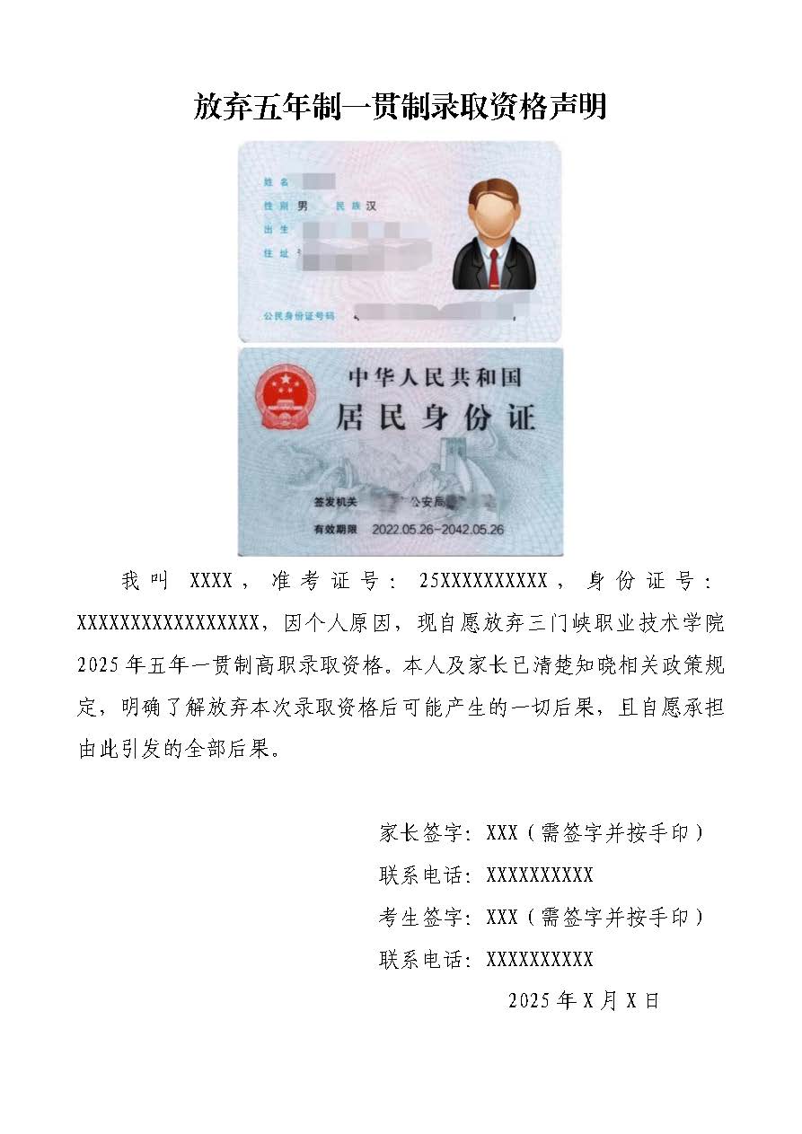 三、名单中拟录取考生若自愿放弃我校2025年五年一贯制高职录取资格,需按附件2所示格式和内容,自行打印签字后,于8月9日15:00-18:00,8月10日9:00-12:00到我校招生办公室(地址:三门峡市崤山西路42号六号教学楼一楼)办理放弃录取手续,逾期将不再办理。若考生未办理放弃录取手续,且被我校录取后未到校报到,由此引发的学籍注册冲突等问题,由考生本人自行承担责任。
