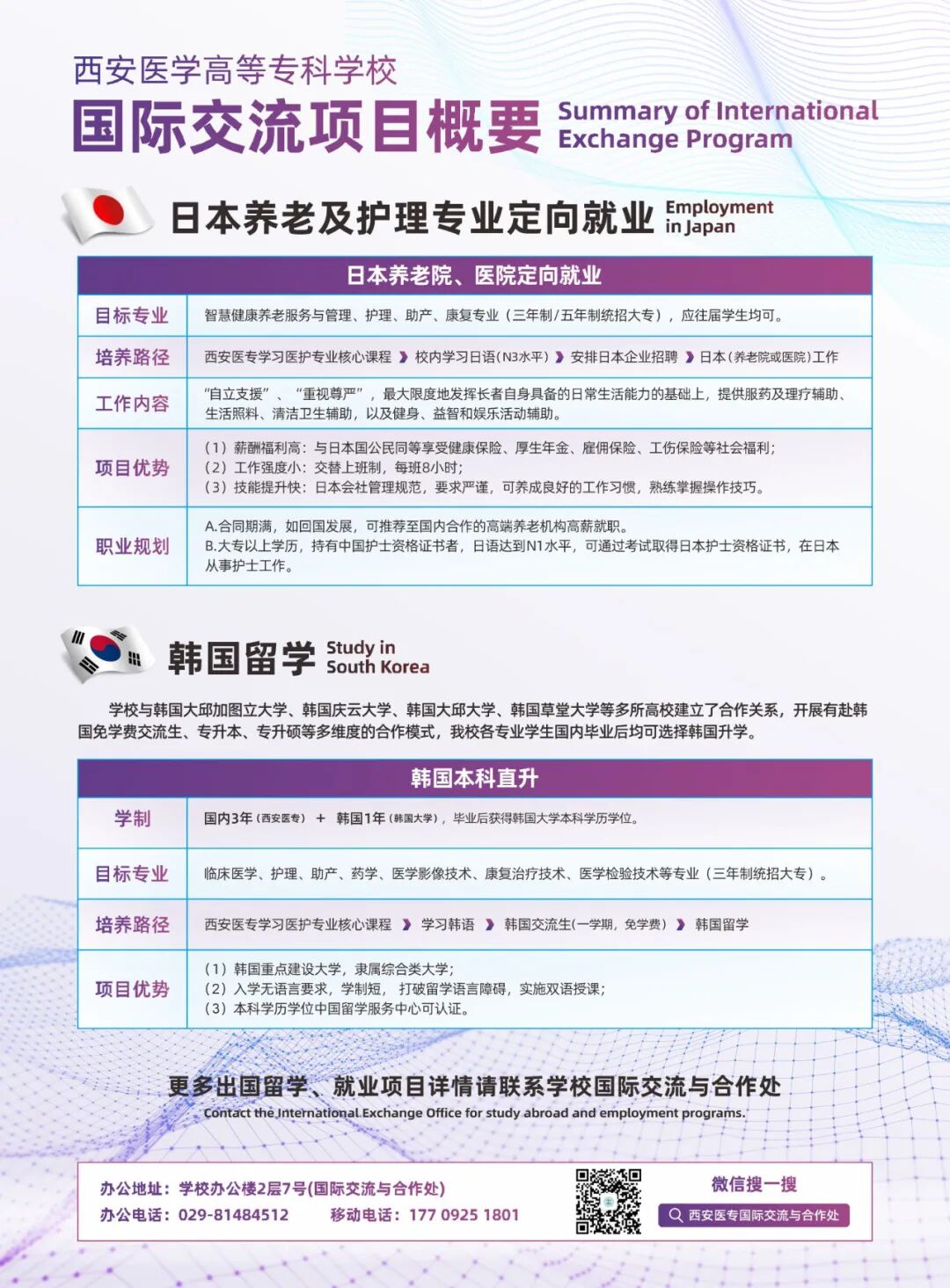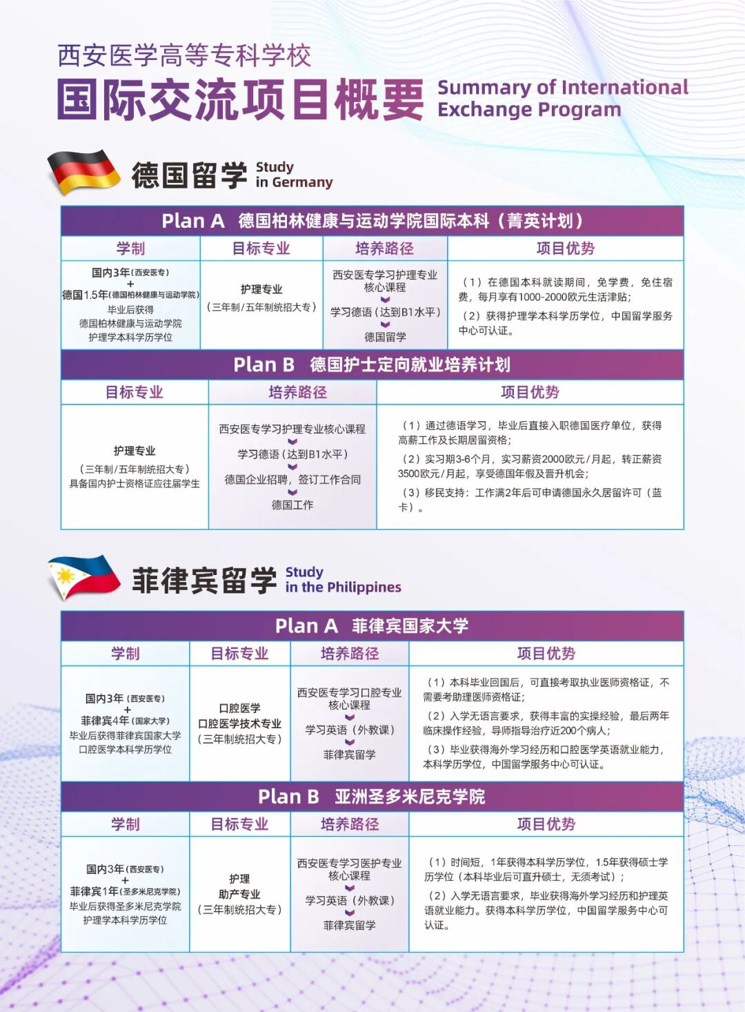 学校与韩国、菲律宾、德国等多国名校开通海外升学通道、就业通道,手持西安医专文凭,世界医疗舞台的大门为你敞开。